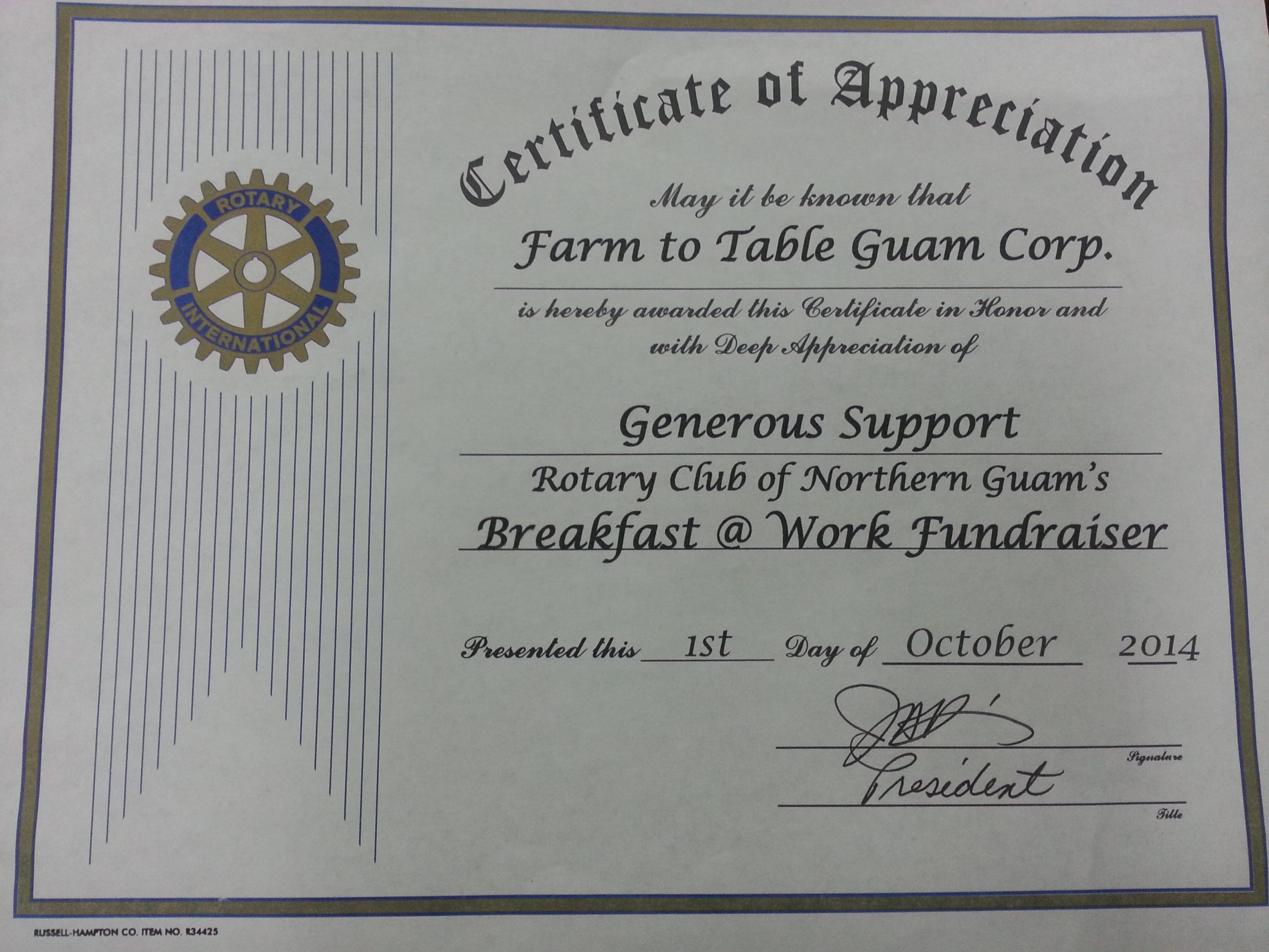 The Rotary Club of Northern Guam held a fundraiser in September 2014 and Farm to Table Guam donated organically grown eggplant that Chef Lenny from Pika’s Cafe prepared dishes with. We were invited as a guest speaker at their monthly meeting thereafter, receiving a certificate of participation and speaking about what services and programs we have to offer the community.